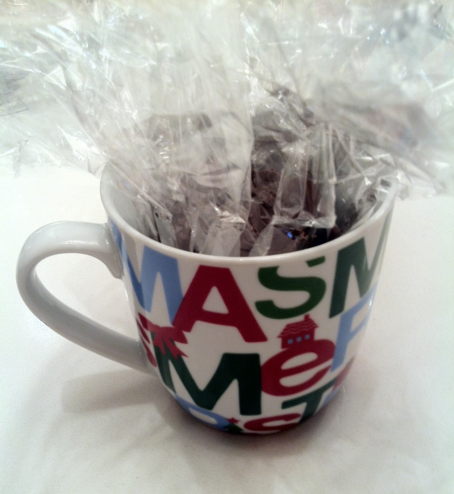 This is the second year I've needed teacher gifts, and like last year, I wanted to make something home made. I found a great recipe for hot chocolate on a stick at GiversLog (which is a great resource for handmade gifts of all sorts) and adapted it to suit. Instead of putting it on a stick, I used some great Santa icecube molds, and I used a mix of milk and dark chocolate. After they set, I packed them into some cellophane in some Santa mugs. Tucked into some cute gift bags, and I had the eight (yes, you read that right!) gifts for Stephen and Irini's teachers, and all in less than half an hour's active work and for less than $4 each.